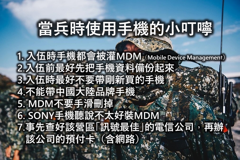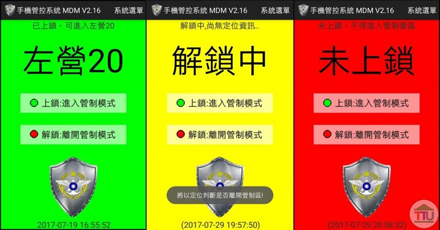 國防部規定,國軍官兵如要攜帶智慧型手機進入營區,除要登記列管外,還要安裝「手機MDM」APP。【MDM】(Mobile Device Managemnt,智慧型手機自動化管理系統),是由台灣國軍2016年與中科院合作推出的智慧型手機管制程式,管制國軍官兵進入營區後不得開啟GPS、藍牙、無線熱點、相機等功能,也會記錄你使用手機的時間以及是否有開啟不能開的功能,若有開啟手機會上鎖,要回國防部資安中心才能解鎖。 如在營區內使用照相等功能,該系統還會立即示警,並通報單位以進行調查及懲處。裝有MDM軟體的手機官兵在離開營區2-3公里後即可解鎖,恢復手機原有功能。