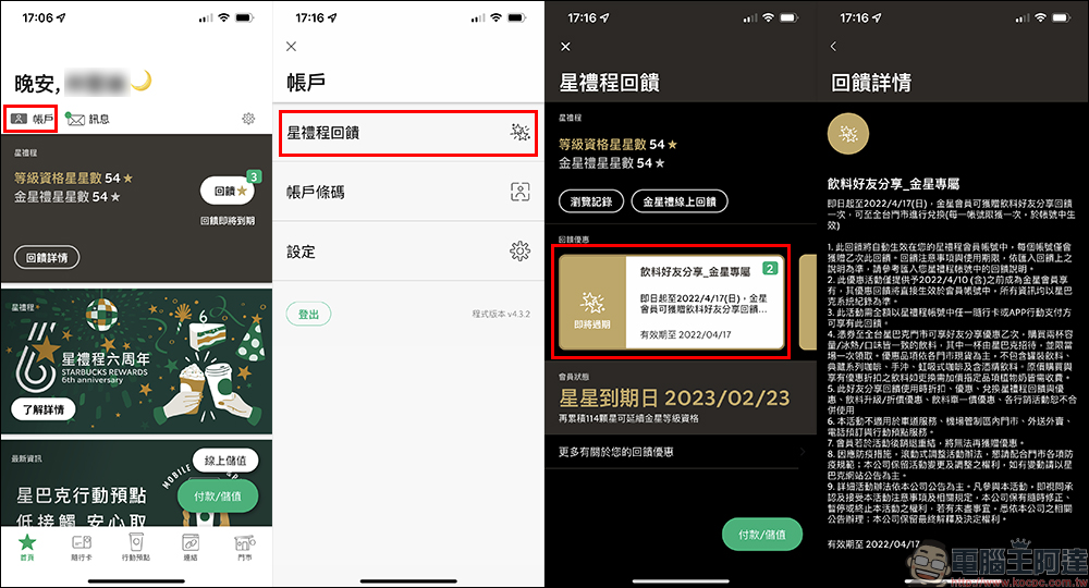 除了在付款頁面, Starbucks TW App 主畫面左上角的「帳戶」頁面內的「星禮程回饋」也會顯示用戶目前持有的回饋優惠。
