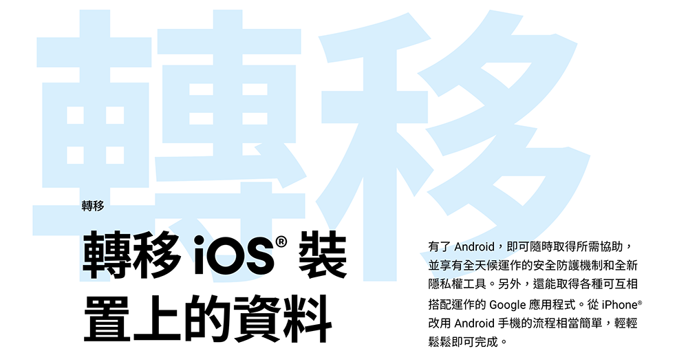 雖然其他 Android 手機品牌基本上也有類似的轉移應用;Apple 也很貼心的,早早就在 Google Play 應用程式商店放上了「移轉到 iOS」的應用。而由 Google 所提供的解決方案,也將先前只有「轉移到 Android」官方頁面所提供的四步驟 - 包括教你怎麼用 Google 硬碟備份資料與關閉 iMessage / FaceTime 來避免錯過訊息來電等方法。
