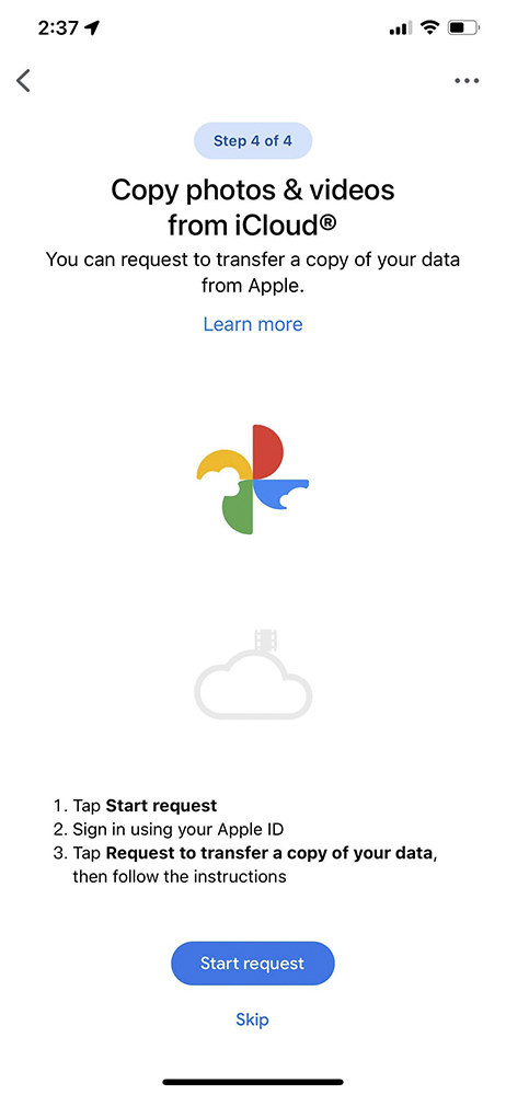[caption id="attachment_435883" align="alignnone" width="1000"]雖然與先前轉移到 Android 官方頁面相同,Switch To Android app 也提供了四個主要步驟。不過其中的備份步驟還把本機與協助備份 Apple ID 的 iCloud 雲端空間的部分分開。不過依然有引導你關閉 iMessage / FaceTime 的部分 - 省略掉的是原本看起來不太必要提到的「在新手機登入帳戶」步驟。