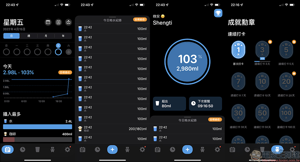 在設定好個人的體重與一天所需的喝水目標後,就能開始使用「喝水時間」 App 囉!這款 App 的介面設計相當直覺,主畫面可顯示今日目前喝水的達成目標、快速添加喝水量,系統也會將用戶每日、每週、每月、每年攝取的水、咖啡等飲料的比例完整記錄。另外,喝水提醒 App 也設計了一系列「成就勳章」讓用戶可堅持每天打卡、培養喝水的習慣。