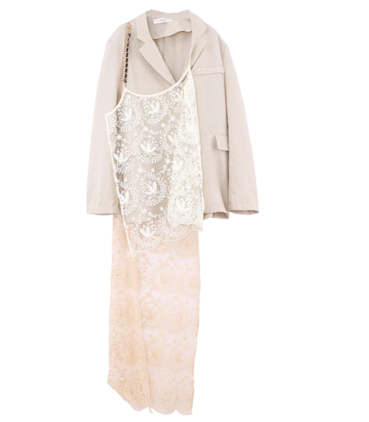 SHUN DE MODE 蕾絲吊帶拼接西裝外套讓你一穿上就走在時尚潮流的尖端,相當適合在時尚產業工作的朋友穿搭出席重要的工作聚會,能讓你散發獨一無二的女人味與穿搭質感,同時又不失專業感。很推薦下面可以穿搭個紗裙,延伸蕾絲拼接的夢幻質感,讓你氣質感UP UP,成為全場焦點。