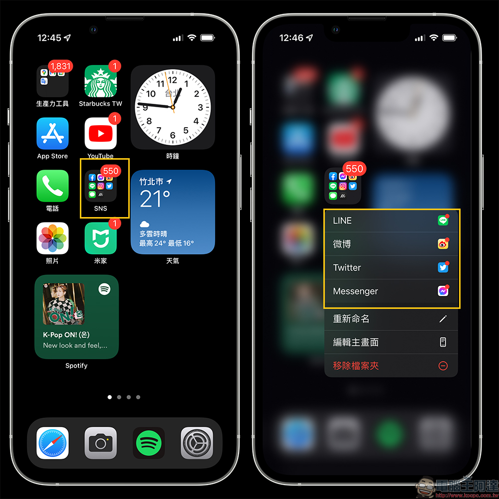 其實用戶只要對著這個檔案夾進行「長按」,當展開選單後,這時除了會顯示重新命名、編輯主畫面、移除檔案夾,這時如果該檔案夾內有具備「小紅點」通知的 App ,也會直接列在這選單之中,那麼用戶只要點擊想「解鎖」的 App 就能前往開啟,了解是有哪些未讀的新內容囉!