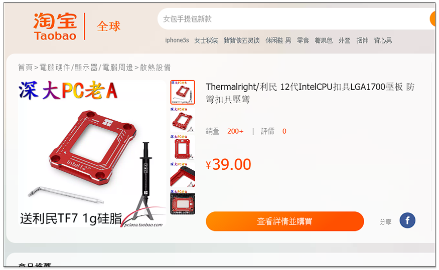 不過如果你真的還是不喜歡可能彎曲現象,最近在淘寶就出現一款由台灣公司 Thermalright(利民)推出的「12 代 Intel CPU 扣具 LGA 1700 壓板 防彎曲扣具壓彎」產品,型號是 LGA1700-BCF RED。不過這款我在台灣賣場似乎找不到,官網也沒有相關介紹。