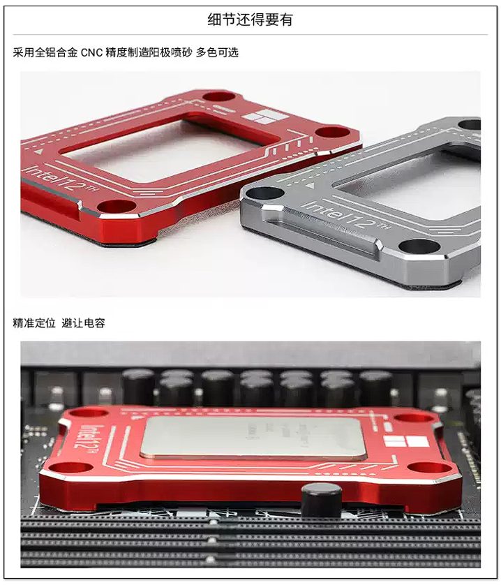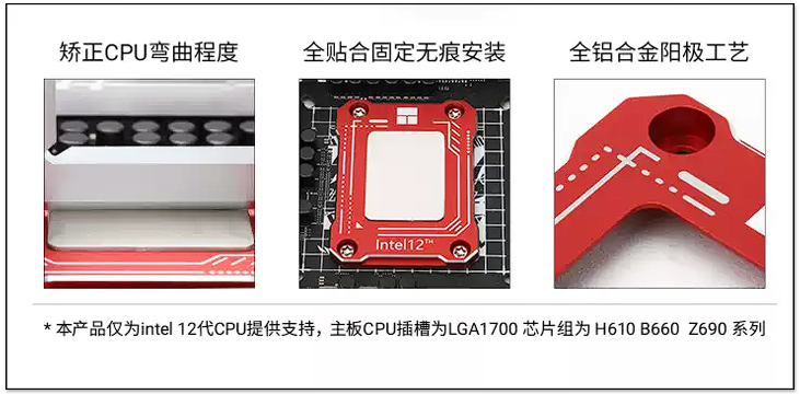 LGA1700-BCF RED 其實就是一個支架,安裝很簡單,可直接放在 LGA 1700 的插槽上,標榜能矯正 CPU 彎曲程度,採全鋁合金工藝: