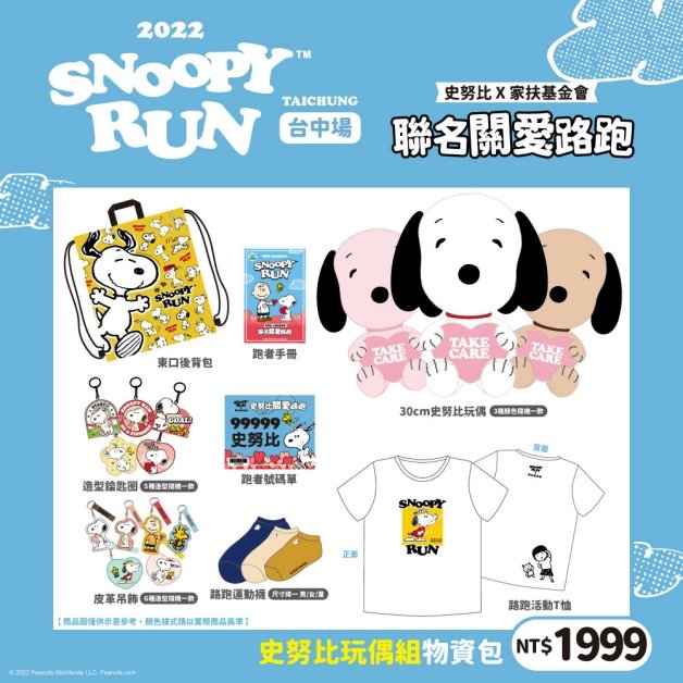 「1999元史努比玩偶組」物資包,包含經典組所有品項之外,還有史努比木製鑰匙圈、束口後背包、襪子(三擇一)和30公分史努比玩偶,這款絕對物超所值,路跑還能把史努比娃娃帶回家,共有白、粉和咖啡三色,款式隨機!