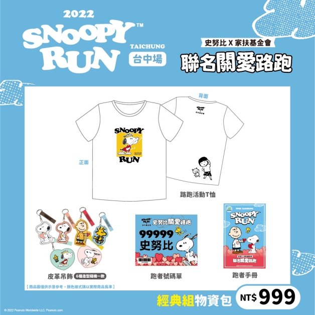 「999元經典組」物資包,內含有號碼牌、活動T恤(男/女/童擇一)、跑者手冊、花生漫畫人物皮革吊飾,吊飾有史努比、查理布朗和胡士托等,款式隨機,收藏價值極高!