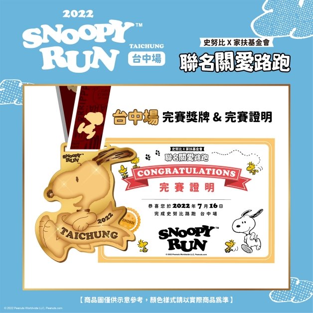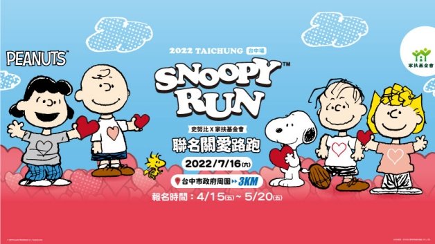 史上最會賺錢的狗狗is coming~史努比今年攜手家扶基金會舉辦「SNOOPY RUN 史努比」,首站選在「台中」,地點位於「台中市市政府周邊」,總長3K,2022年4月15日正式開放報名,2022年7月16日開跑,除了實體路跑之外,也同步推出線上路跑,即使人無法到台中也沒關係,只要穿上跑鞋,整個城市都是妞妞們的跑道!