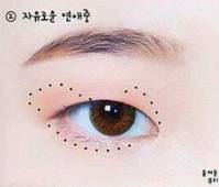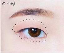 1:女生先在虛線的位置掃上淺淺的一層粉色眼影作打底