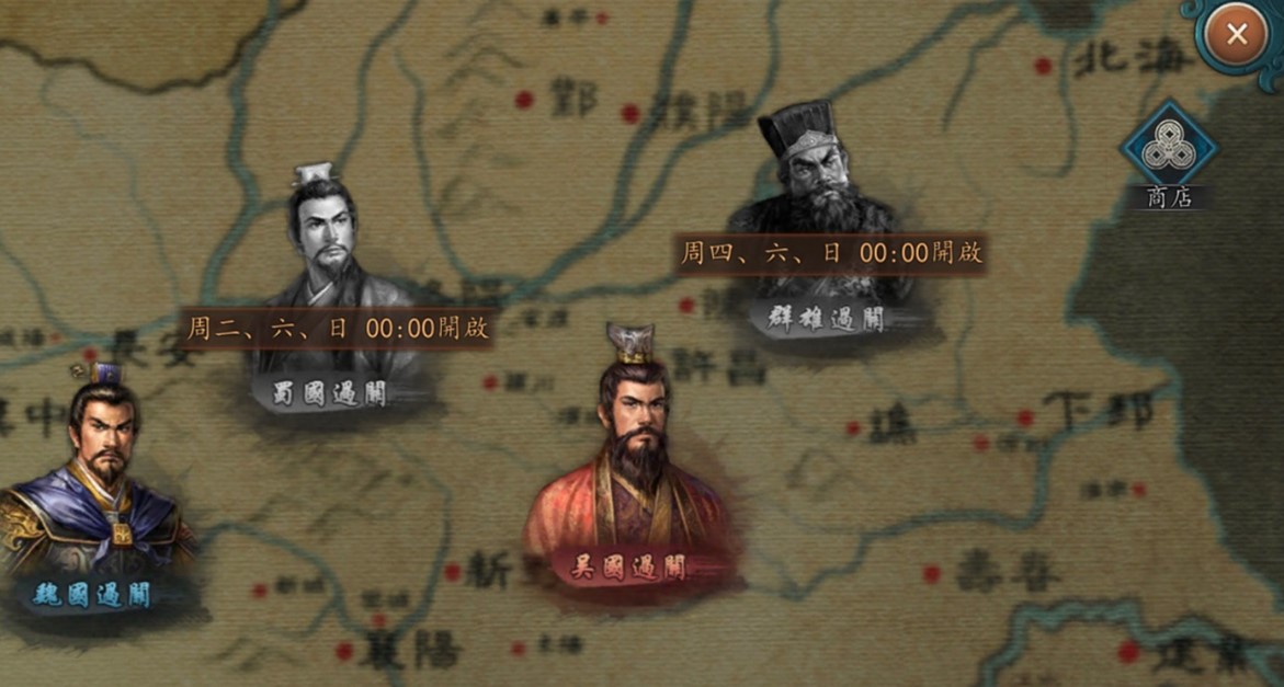 新版本的過關斬將改變過去每90天才會有新一輪的國家拜官的方式,【過關斬將】將變為副本模式,每天開放魏蜀吳群四個不同類型的副本,四個勢力的商店則全天候開放,讓玩家可以最快速度拜官紅將!。