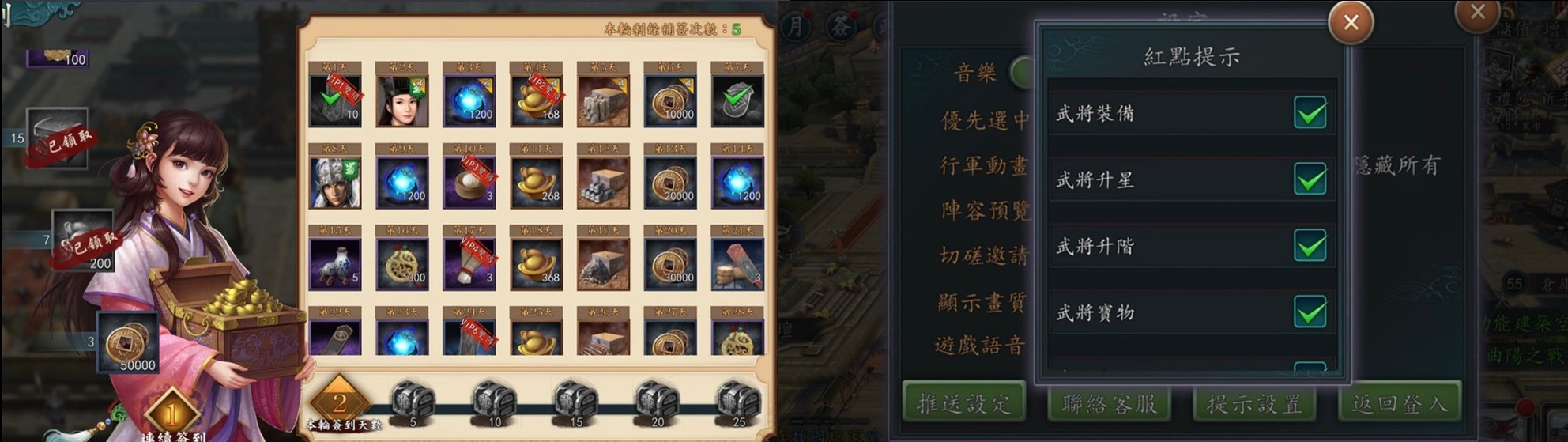 設置介面新增紅點提示自訂,主公可決定哪些功能需要紅點提醒 ,簽到新增補簽功能。