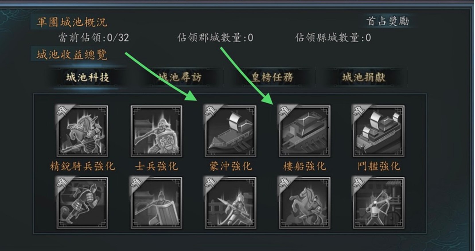 新增部分城池科技,如戰船科技,部分城池科技不可疊加,如精銳騎兵強化,佔領多個城池僅生效最高數值。