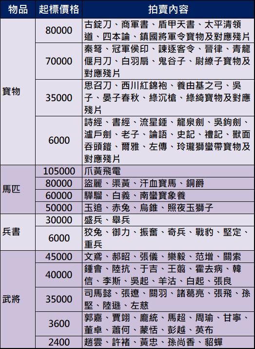 軍團拍賣行一共有寶物、馬匹、兵書及武將四種類型商品可供競拍,並分別對應在軍團玩家參與群雄討董、護送馬商、長安爭奪戰及軍團跨服戰活動(軍團聯賽與漢中之戰)。