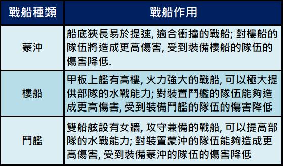 戰船總類有三種蒙沖、樓船、鬥艦三種,三種戰船之間相互克制(蒙沖剋樓船、樓船剋鬥艦、鬥艦剋蒙沖),可在陣容介面配帶戰船。