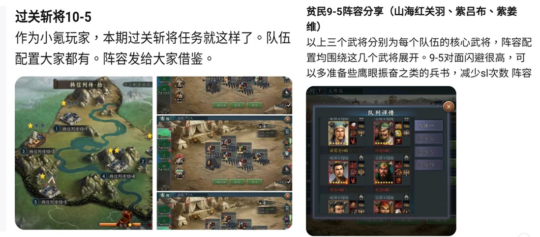 由於新過關斬將攸關玩家取得拜官道具的速度,在陸版論壇上出現不少分享過關斬將配陣的分享。根據陸版玩家的分享,10-5關將是少課平民玩家的大魔王關卡。不過,因新三國志手機版少了武將突破的功能,預期新過關斬將的難度會比陸版還高,所以版主認為平民玩家恐怕都會卡在第九關而已,平民玩家的拜官的速度還是得依賴時間來克服。