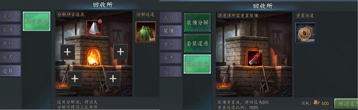 回收所增加道具分解介面,可分解拜官道具,以獲得特殊貨幣,兌換各類資源。已升級裝備可於回收所進行重置,返還銅幣。