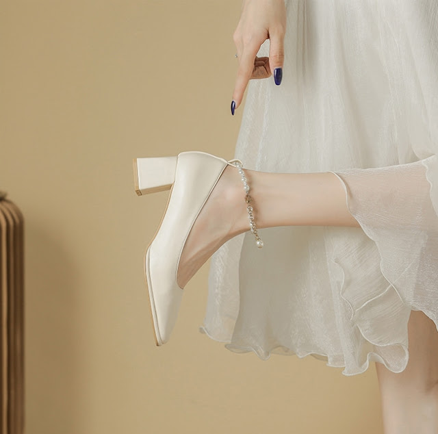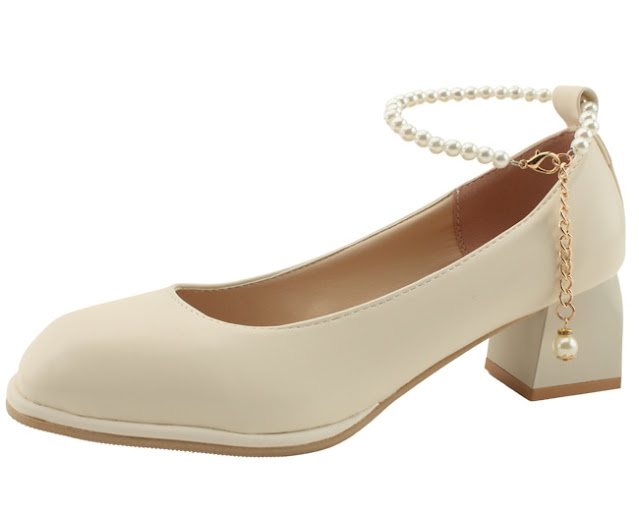 典雅名媛風的重點在於簡約,不一定要細跟、鑲滿珍珠才像名媛。粗方跟的跟鞋少了銳氣,好走好站之外造型也更婉約。可拆式珍珠帶加上珍珠延長鍊墜飾,有腳鍊的視覺效果,看起來也更為高雅,米白色更是百搭。