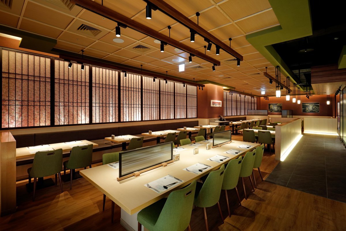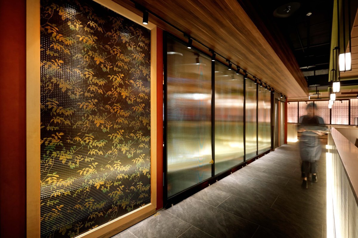 店舖內每⼀處皆來⾃下村先⽣的細節安排,隨著⼿扶梯逐漸往上,映⼊眼簾的巨⼤燈籠,那瞬間就有來到日本的氛圍。延續京都傳統⽊質調「⼟間台」概念的料理展⽰台、隔著紙窗屏障觀賞的櫻花、⽇本傳統⿃獸戲畫裝飾,皆在光影的暖⾊調下呈現⽇本⽂化之美。