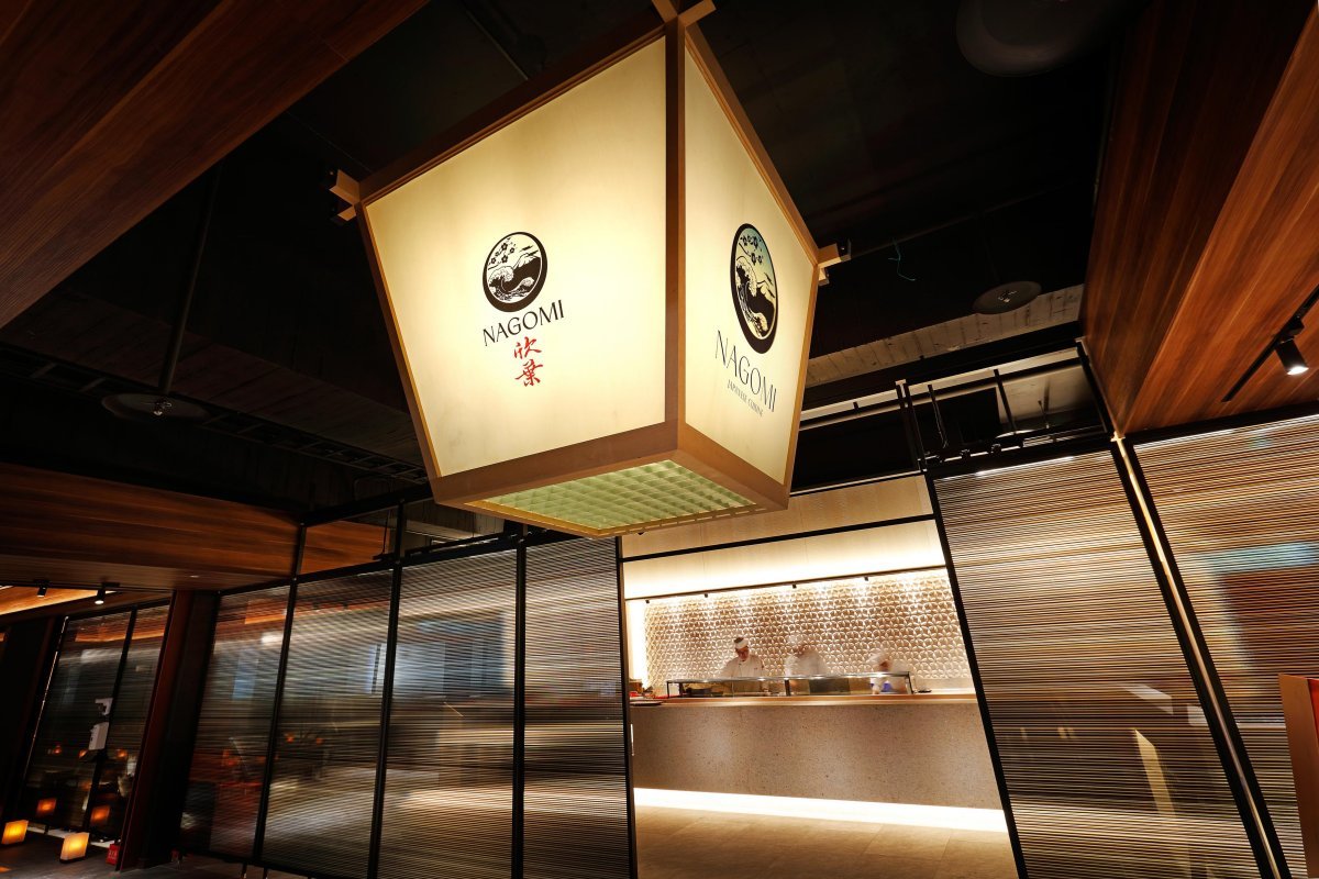 NAGOMI的裝潢設計和氛圍都是特別經過設計的,特別邀請⽇本室內設計師「下村伸也」先⽣,以⽇本「數寄屋」建築為概念,利用⽊頭、⼟牆、和紙、原⽯的質樸意象出發,打造揉和現代與傳統的⽇本⽂化新美學。