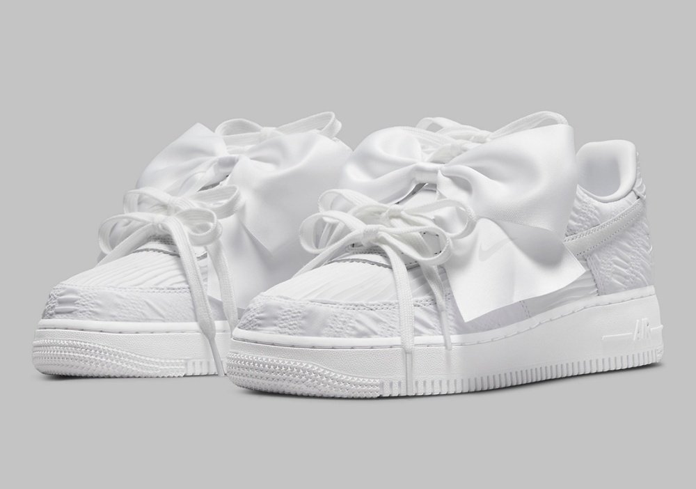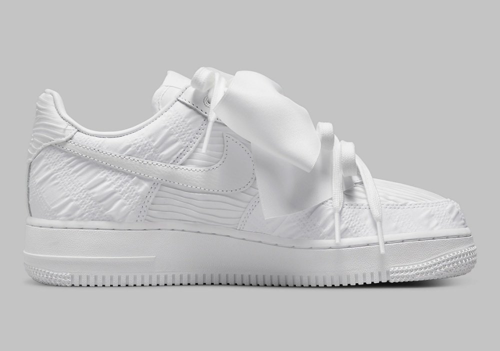 這次曝光的超大蝴蝶結Air Force 1,是由系列中有著偏修長鞋身的Fontanka鞋款進行設計,除了最搶眼的超大緞面蝴蝶結之外,這雙鞋的鞋帶部分也是搭配4個蝴蝶結的造型,在鞋面上常見的透氣孔洞也改為不規則的條紋皮革鞋面設計。