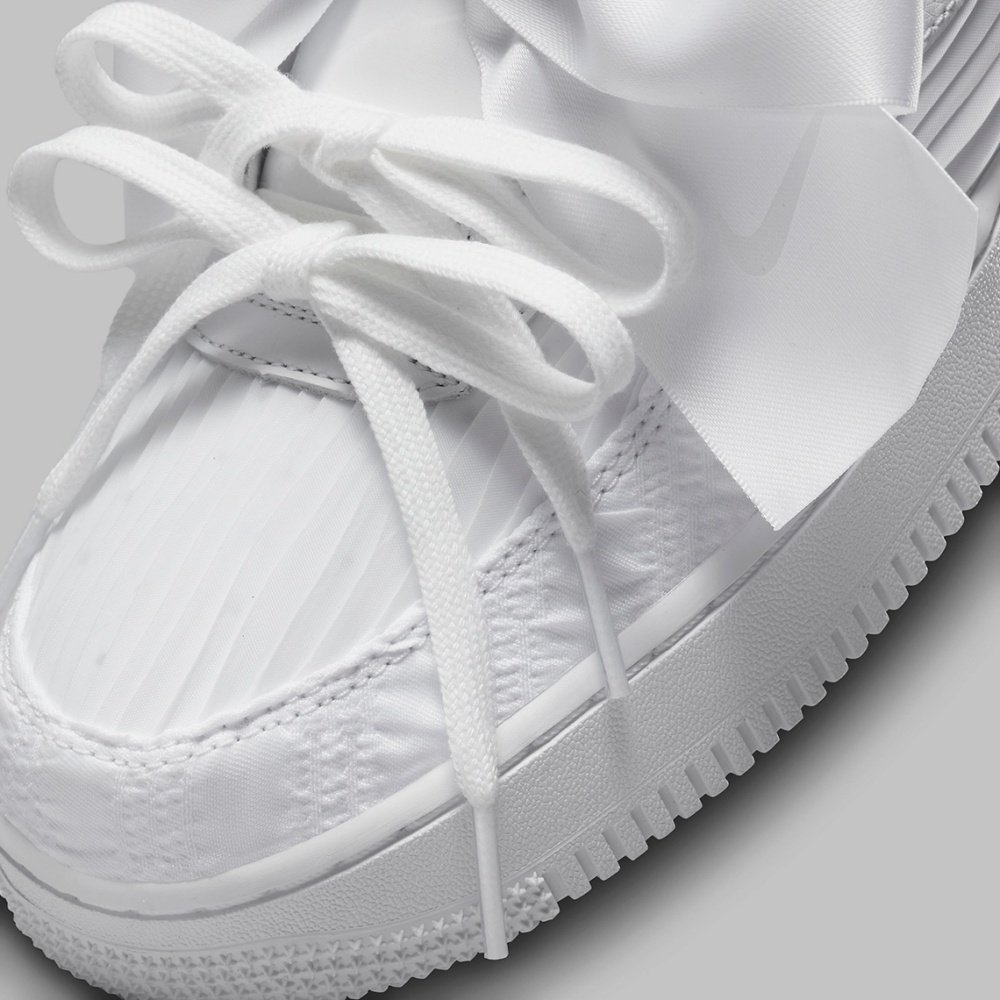 看完了鞋身後,就輪到這次鞋款上最搶眼的存在-超大蝴蝶結!這次搭配在鞋上的可拆卸蝴蝶結,以白色緞面材質設計,搭配上這次帶有皺褶感的白色鞋面,看起來甜美又時髦,在蝴蝶結的垂墜緞帶處還印有一個白色的NIKE小勾勾圖案,不管遠看近看都非常精緻,目前這雙鞋款尚未公布正式上市的時間與售價,妞編輯會持續幫大家關注更新,有興趣的妞妞們記得先把這個加入購物清單中囉~