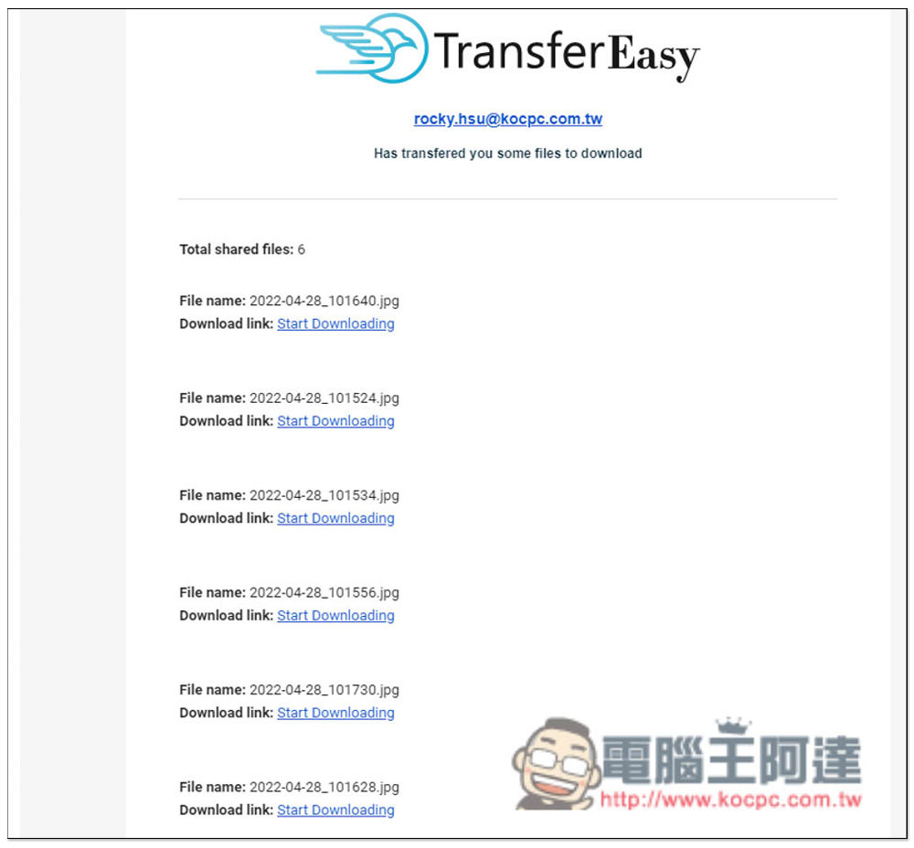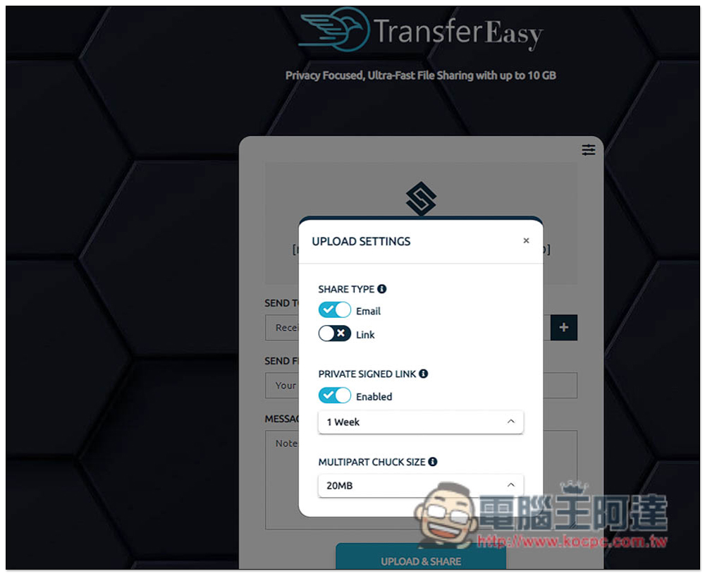 寄送 E-Mail 要添加大型附件檔案、又或是有一些檔案想分享給其他朋友時,如果不是什麼太重要的檔案,TransferEasy 算是一個很不錯的替代檔案分享服務,不用佔用你自己的雲端空間。TransferEasy 完全免費,上傳前可指定你是要使用 E-Mail 還是獲得下載連結,單檔最大支援到 10GB,單次最多更能達到 10,000 個檔案,這應該是我目前看過數量最多的檔案分享服務,而且還可以設置自動刪除日期,非常好用,推薦給大家。