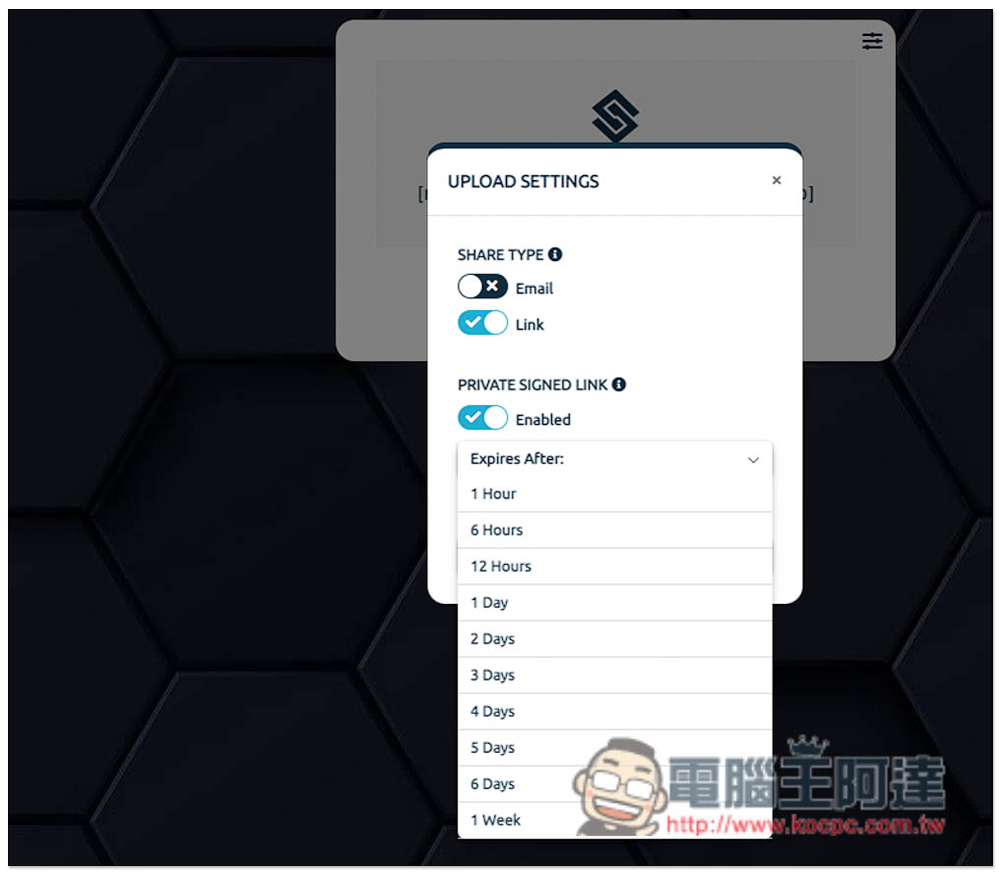 點擊右上角圖示可更改設置,包括你想要使用連結下載的話,就把 SHARE TYPE 改成 Link(打勾),下方還能調整檔案過期日,預設為 1 週,不想過期就把 Enabled 給關掉: