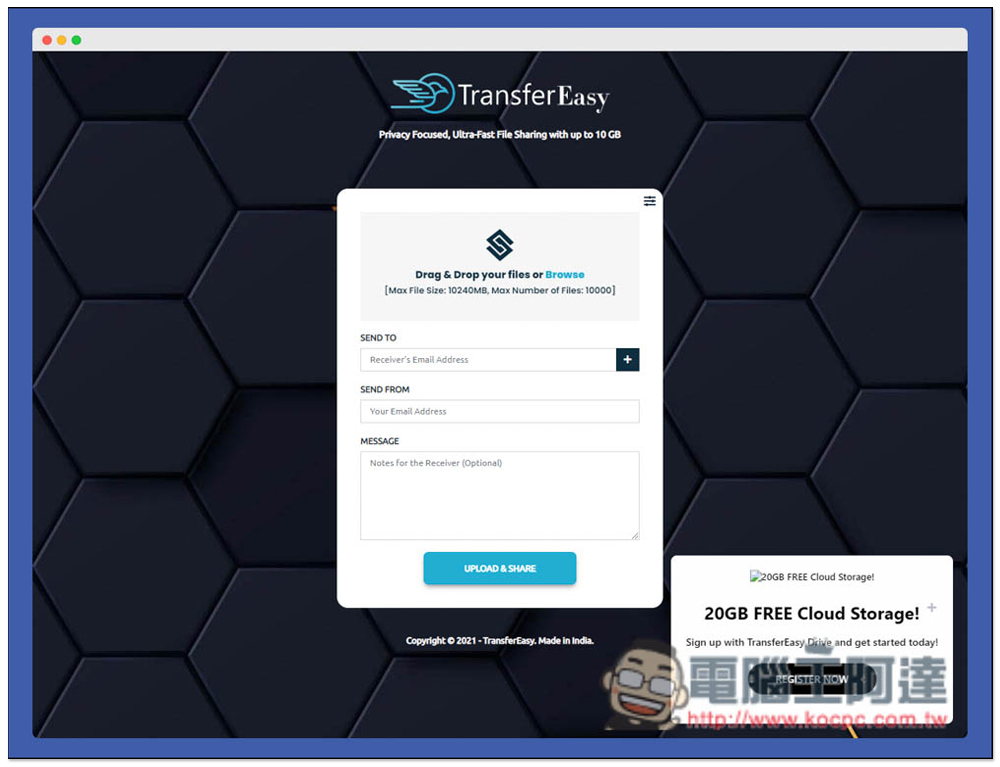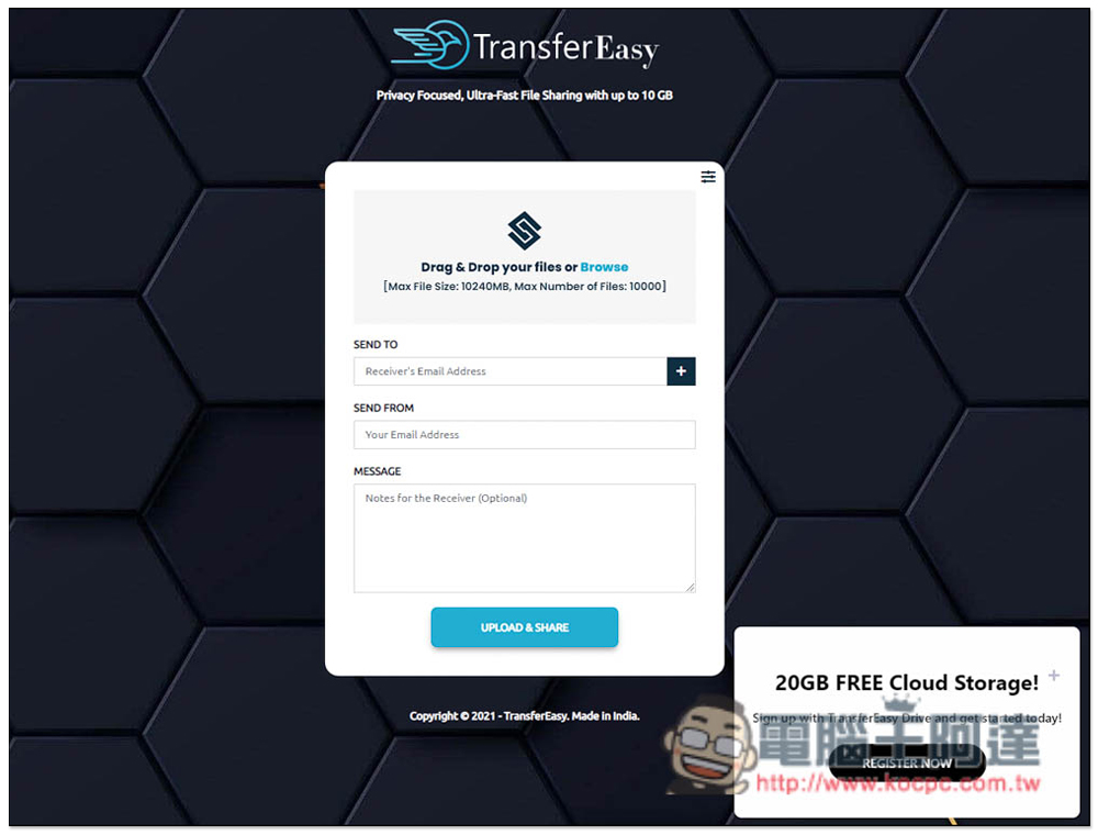進到 TransferEasy 就可以開始上傳你要分享的檔案,預設為 E-Mail 模式,可以設定你要寄送給誰(對方的 E-Mail 地址)以及你自己的 E-Mail 地址,這兩個必填,訊息內容就選填,有需要再寫就好。另外這檔案服務還提供 20GB 的免費雲端空間,你可以控管分享的檔案,不過需註冊會員才能獲得,就看你有沒有需要: