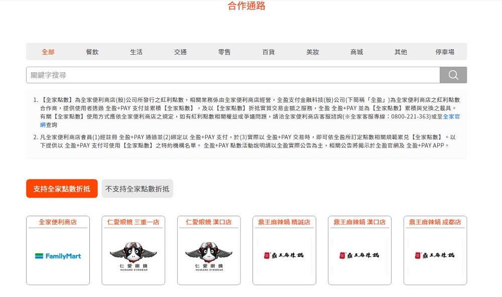 而官網目前也有列出「全盈+PAY」支援全家點數折抵的合作通路,有全家便利商店;仁愛眼鏡三重一店、漢口店;鼎王麻辣鍋精誠店、漢口店、成都店等。