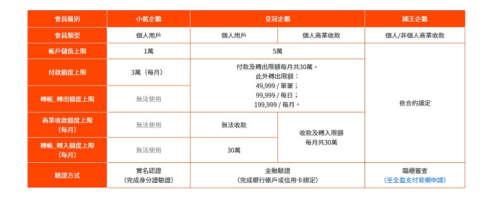 「全盈+PAY」分為小藍企鵝、皇冠企鵝與國王企鵝3種會員種類,小藍企鵝為最基本的會員資格,帳戶儲值上限為1萬,每月付款額度3萬;另外皇冠企鵝的個人用戶需完成信用卡或銀行帳戶綁定,帳戶儲值上限為5萬,付款及轉出限額每月共30萬(轉出限額49,999 / 單筆;99,999 / 每日;199,999 / 每月)。