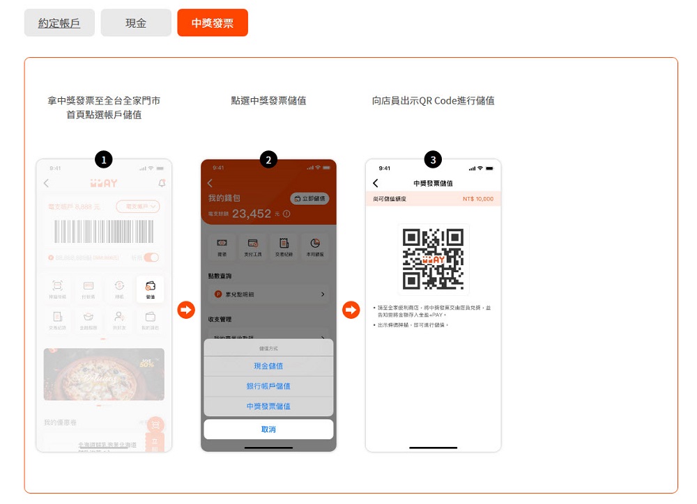 「全盈+PAY」官網也介紹幾種常用的服務,「儲值服務」,提供約定連結存款帳戶、現金或中獎發票儲值。