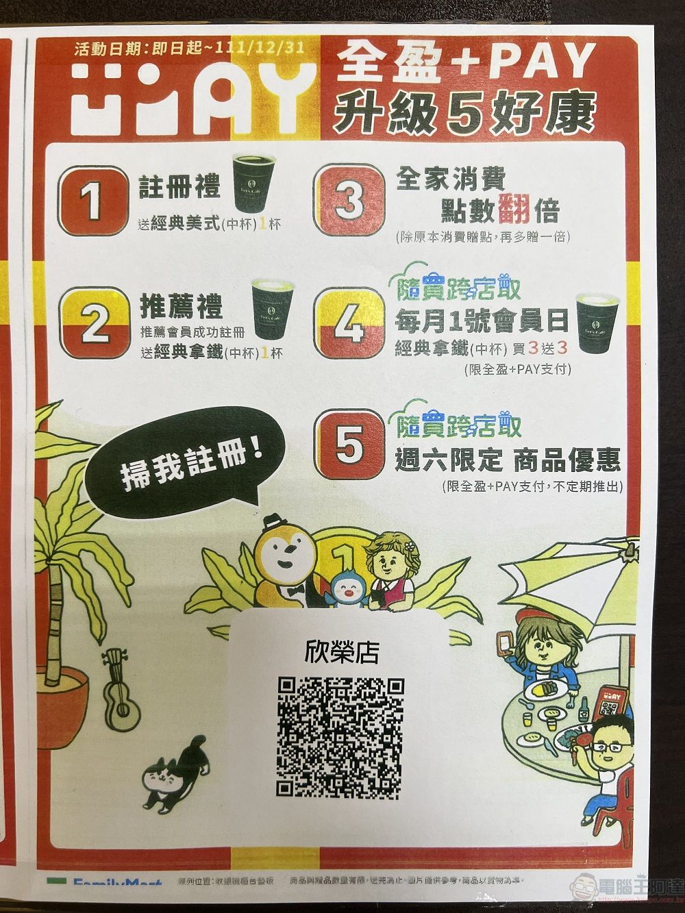 為了推廣「全盈+PAY」的使用,全家便利商店即日起至12月31日也推出「全盈+PAY升級5好康」優惠活動,包含註冊禮、推薦禮、消費點數再翻倍等活動。