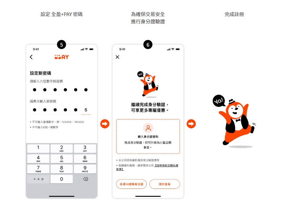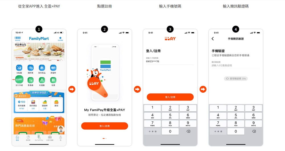 想要註冊「全盈+PAY」可先在全家APP點選「支付升級」,接著依序輸入手機號碼、簡訊驗證碼、設定 全盈+PAY 密碼,完成身分證驗證,來取得「全盈+PAY」最基本的小藍企鵝會員資格。