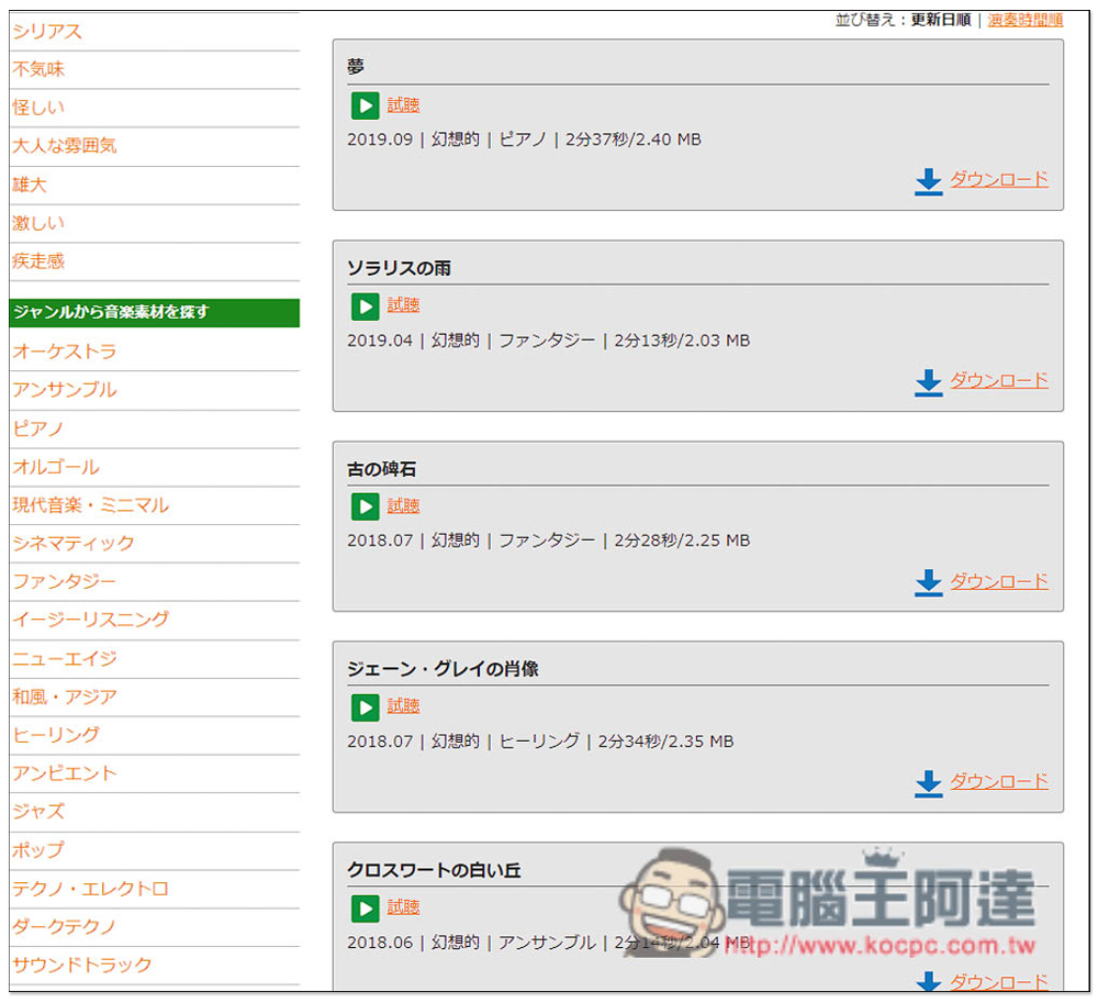 進到「甘茶の音楽工房」網站之後,首頁會顯示最新是傳的音樂素材,雖然從 2019 年 9 月 12 日之後就沒再更新,但已經有的音樂素材數量也不少,左側有完整分類,看不懂日文的人可以用整頁翻譯。這邊的音樂都是網站原創,因此應該在其他網站上找不到: