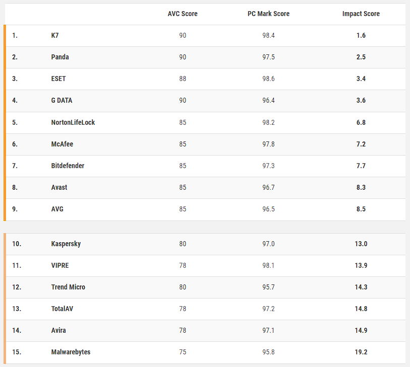 最後統計總分,K7 表現最好,只有 1.6 分的影響,Panda 也不錯,再來是 ESET、G ATA、NortonLifeLock、McAfee 等等,前 9 名被 AV-Comparatives 評為三顆星推薦,10~15 名則是二顆星: