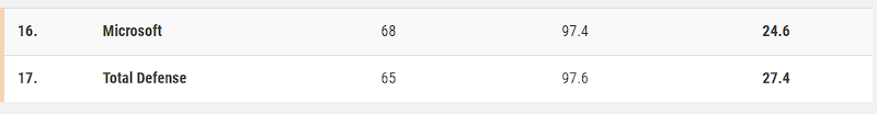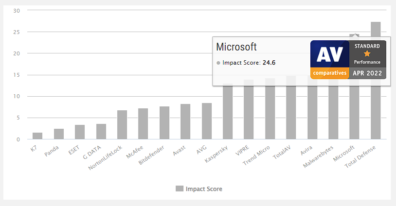 Microsoft Defender 最終只領先 Total Defense,影響分數達到 24.6,也因此只獲得一顆星: