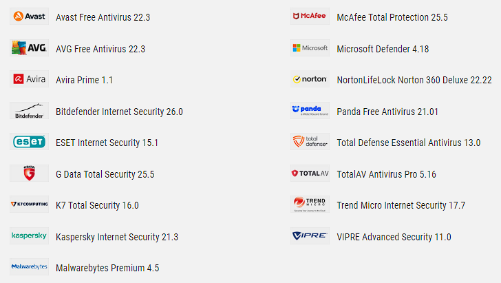 17 款防毒軟體清單如下,無論是大家都知道的 Avast、ESET、卡巴斯基、趨勢科技、Norton、Microsoft Defender,以及台灣比較少人聽過的 VIPRE、K7、TotalAV 等都有,某些防毒軟體使用的是免費版本: