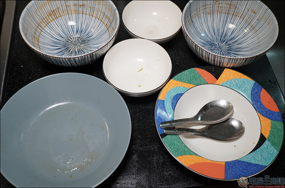若不趕時間、想洗滌多數類型的餐具可選擇「標準洗」模式,將進行 114 分鐘的洗滌時間。以下用餐後的餐具有乾掉的咖哩、胡椒粉以及丼飯的醬汁等殘渣。