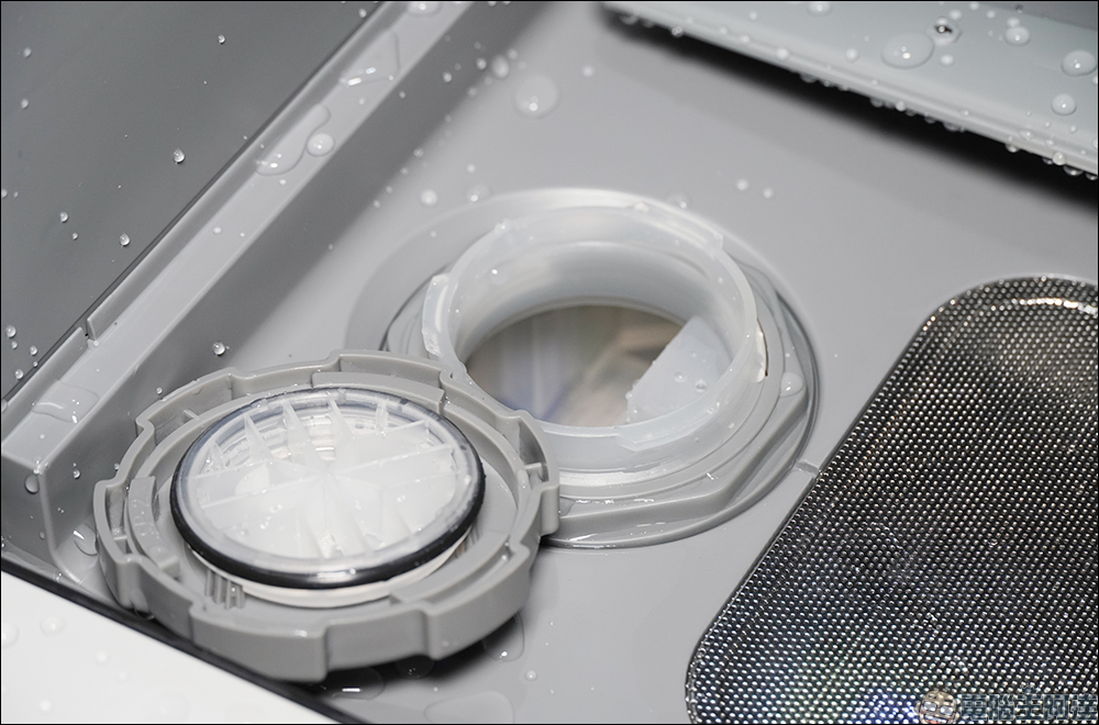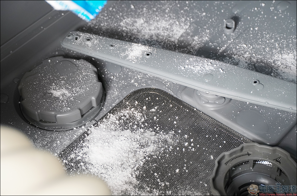 通常一般的自來水都是「硬水」,若直接洗碗盤的話都會有水垢(大家自己看看浴室的玻璃或鏡子就知道了)。如果比較講究的人,會另外在家安裝軟水設備。而 VIOMI 雲米方糖洗碗機則設計了讓用戶自行添加洗碗機專用軟水鹽的位置,只要打開蓋子將軟水鹽倒入即可,軟水鹽的取得方式也十分容易,在大賣場都能買到。
