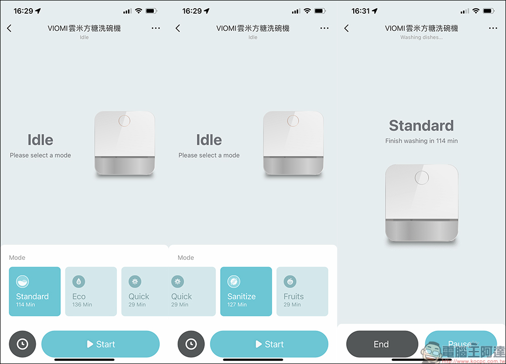 VIOMI 雲米方糖洗碗機內建標準洗(114 分鐘)、節能洗(136 分鐘)、快速洗(29 分鐘)、消毒洗(127 分鐘)以及蔬果洗(29 分鐘)等五種洗滌模式選擇,用戶可直接在洗碗機的觸控面板或米家 App 直接控制。