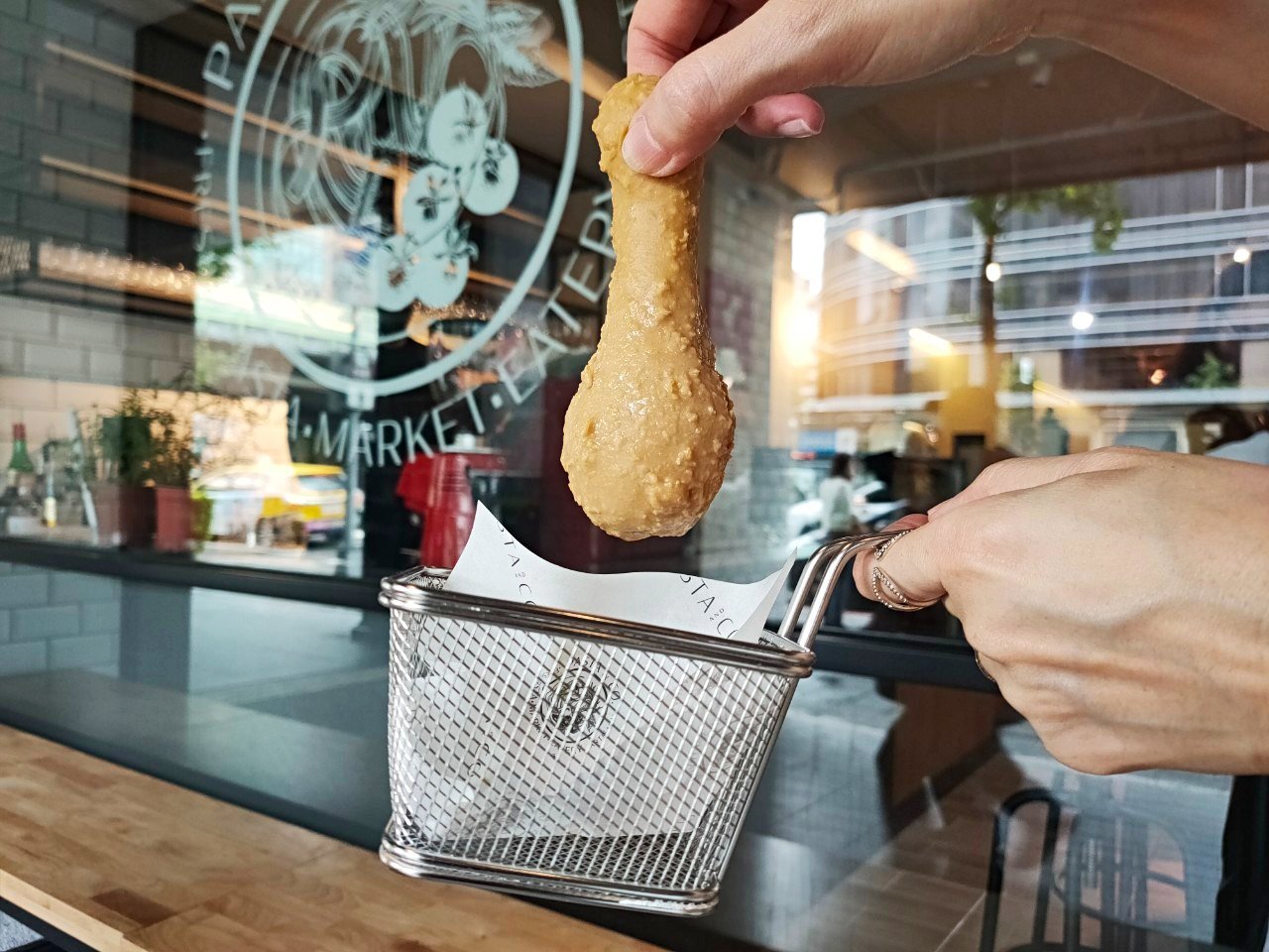 這不是炸雞~它可是「閃電泡芙」喔!PASTA & CO.特別與人氣法式甜點「1789 Café Pâtisserie」合作,主廚Cyrille結合美國及義大利國民美食元素設計視覺系打卡甜點,這款「焦糖炸雞閃電泡芙」以1789招牌人氣產品海鹽焦糖閃電泡芙,沾裹太妃巧克力讓表面附著玉米片及烤麵包碎,激似外皮金黃酥脆的炸雞腿,入口卻是甜脆外皮與柔滑香甜微鹹風味。
