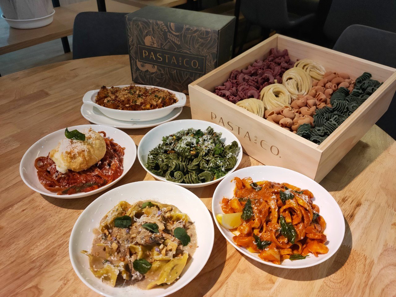 「PASTA & CO.」是由曾在紐約多家米其林星級餐廳修業的美籍台裔主廚「Timothy(呂學明)」所打造的品牌!主打新鮮義大利麵,擁有獨特Q彈口感與嚼勁,加入天然食材賦予繽紛色彩,經手擀或製麵機製成不同麵型,如彎管、蜂巢、水管、雞冠、麵餃、吸管、圓粗、鳥巢寬麵等形色繽紛的麵體;緊鄰人行道的製麵室,透明玻璃設計讓手工製麵過程一目了然,看著師父製麵的專業模樣真的好療癒。