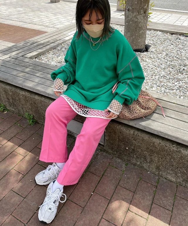 寬鬆的短版上衣本就可以修飾腰身線條,縮短上半身的比例並凸顯腿長,但沒想到內搭網格T的效果大加倍,讓人分不出真正的腰際位置。不想露出肚子的妞妞,除了高腰褲又多了一個新選擇!