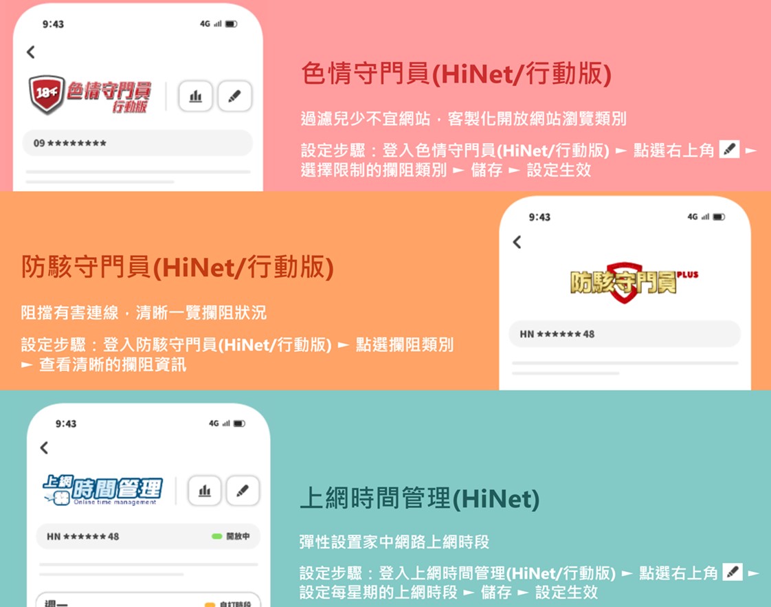 中華電信「手機上網安心Go」方案為其提供的上網管理加值服務,包含「色情守門員行動版」、「防駭守門員行動版」及「行動上網時間管理Pro個人版」服務。