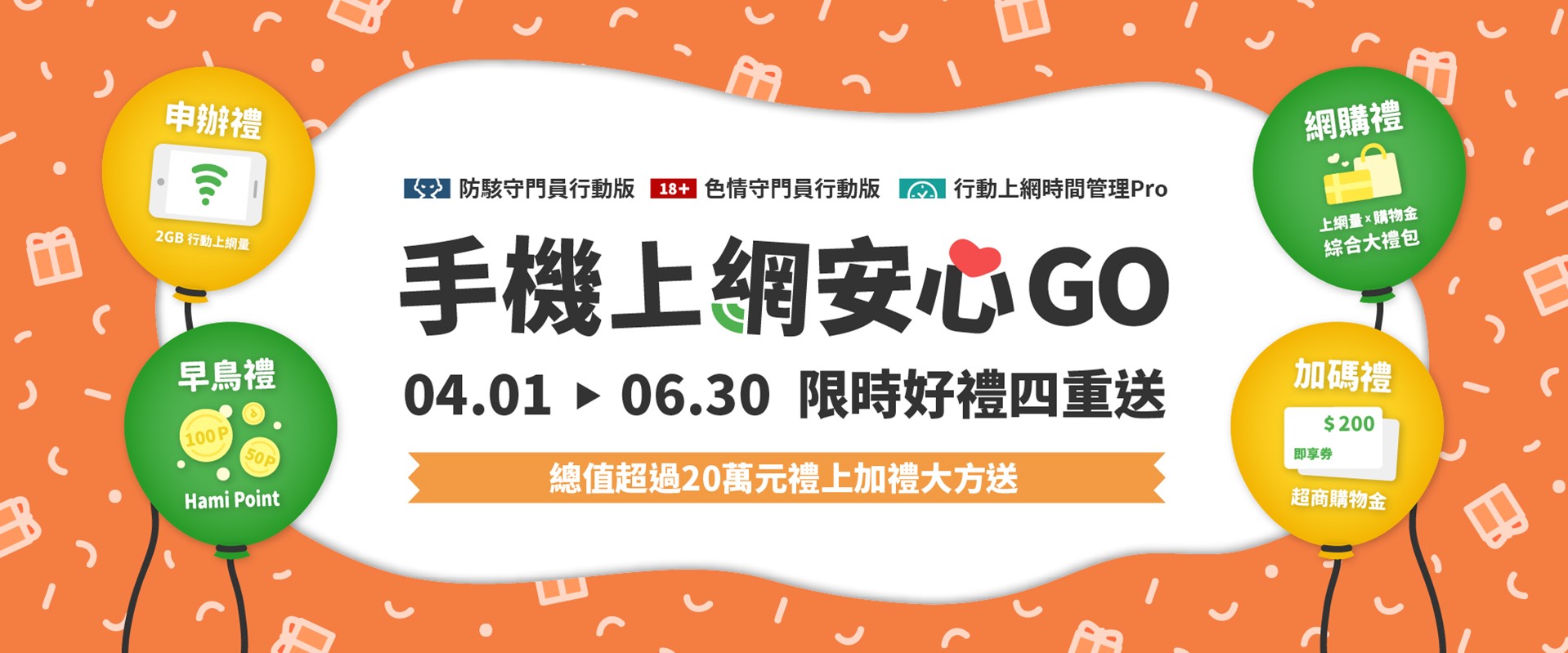 活動期間新申辦「色情守門員行動版」、「防駭守門員行動版」或「行動上網時間管理Pro」任一服務,享有限時好禮四重送: