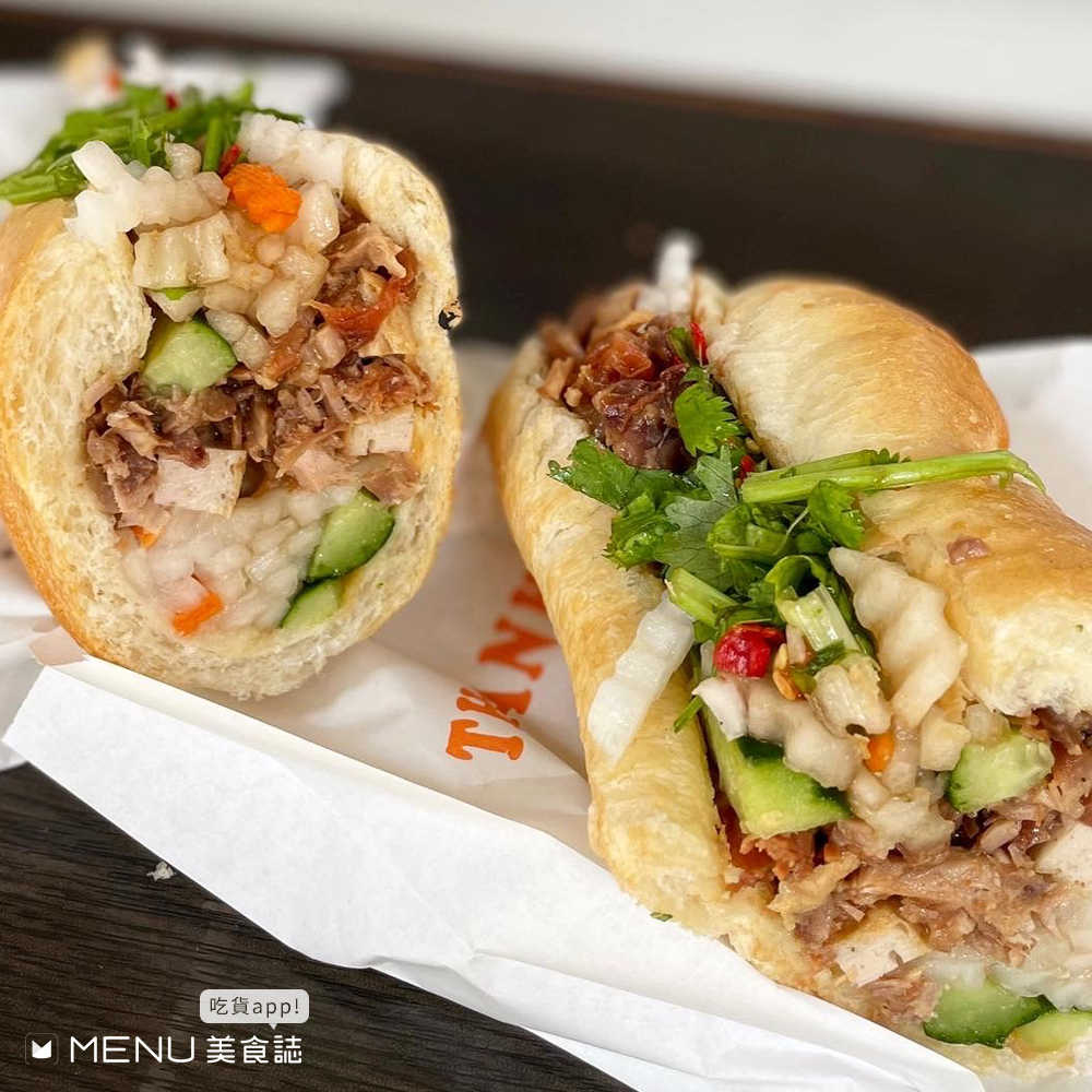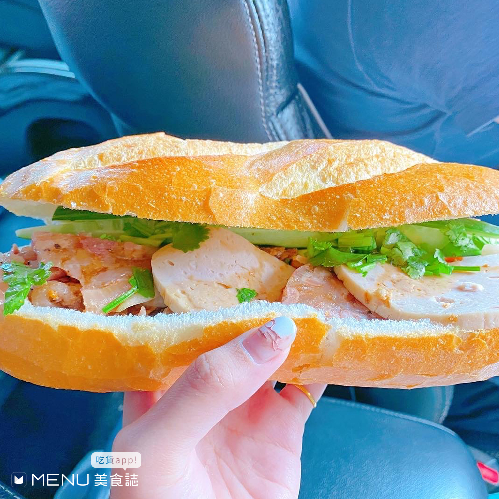 越南法國綜合麵包將一整條的法國麵包,烤過後對切再加入滷豬肉、火腿、醃蘿蔔、小黃瓜、香菜和豬肝醬等食材,內餡相當的豐富,法國麵包表面十分酥脆,咬下去還有卡茲卡茲的口感!