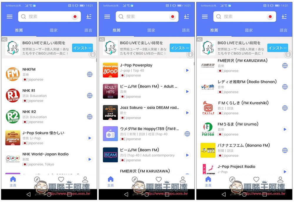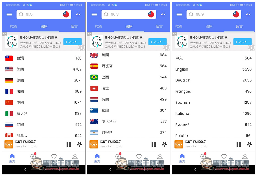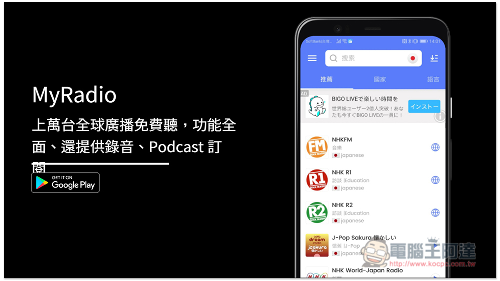隨著網路越來越方便,現在靠手機 App 就能聽全球廣播節目,如果你是用 Android 手機,這款 MyRadio App 就相當不錯,提供上萬台全球廣播,而且分類清楚,不只是國家,還提供 "語言" 分類,如:英文、日文,選擇之後就能找到該語言的所有電台,這對想加強聽力,用廣播學習外語的人來說非常好用。另外聽到不錯的節目內容,還內建錄音功能(需升級付費版),功能相當全面。