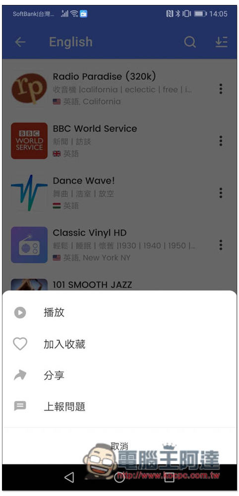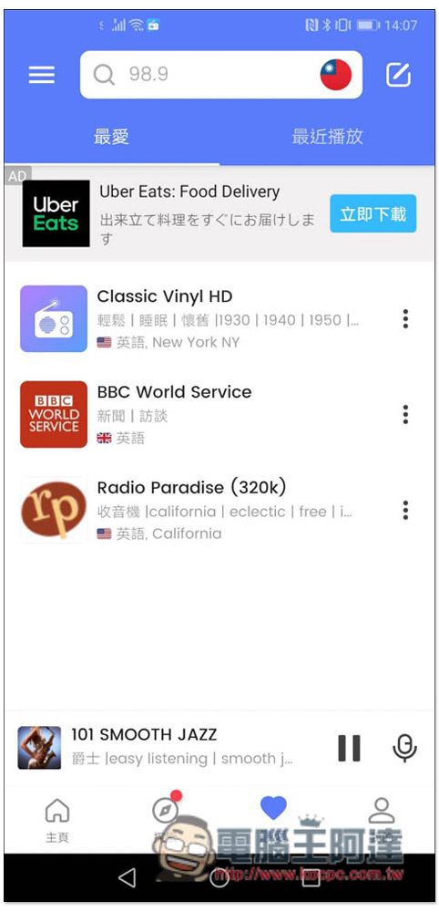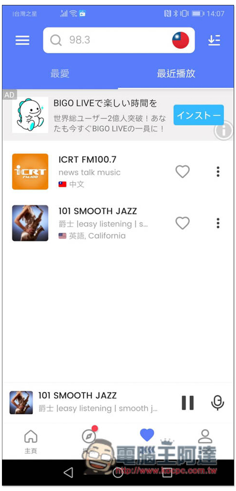找到不錯的電台時,也能加入到收藏清單,方便你下次快速找到並播放: