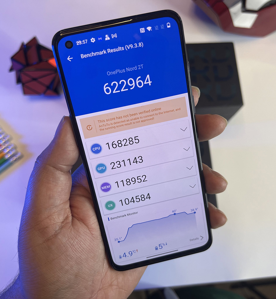 而安兔兔的綜合測試中,OnePlus Nord 2T 獲得 622964 的分數: