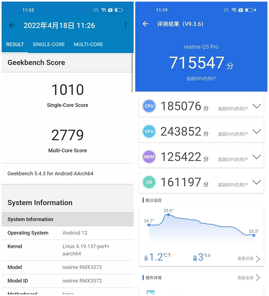 作為比對,下方是高通 Snapdragon 870 的跑分,天璣 1300 的單核心雖然不及高通的 1,010 分,但多核心就跟高通的 2,779 分差不多。不過安兔兔綜合跑分就差距比較大,這台 Realme Q5 Pro 拿到 715,547 分: